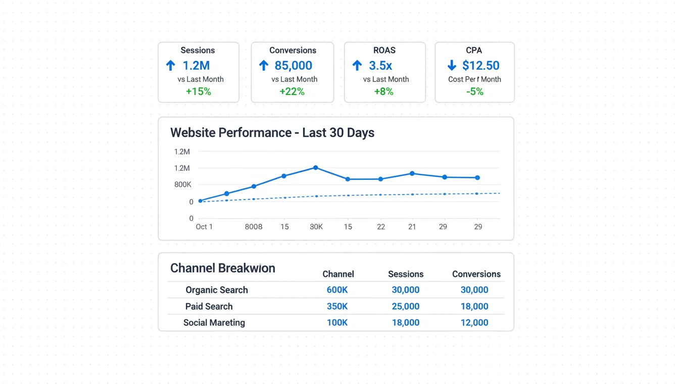 Marketing dashboard is the process of connecting your ad platform data to your actual business results. At the technical level, this involves sending event signals (page views, clicks, conversions) from your website or server to the ad platform, where they are used for bidding, audience building, and reporting.